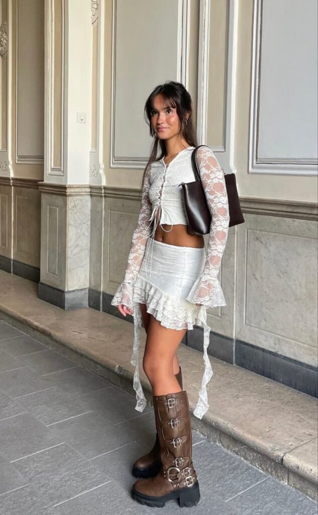 Romantic lace gets an unexpected edge when paired with chunky buckle boots. The delicate white set—complete with ruched detailing, bell sleeves, and ruffled hems—exudes a vintage-inspired femininity, while the knee-high leather boots bring contrast with their rugged, structured silhouette.