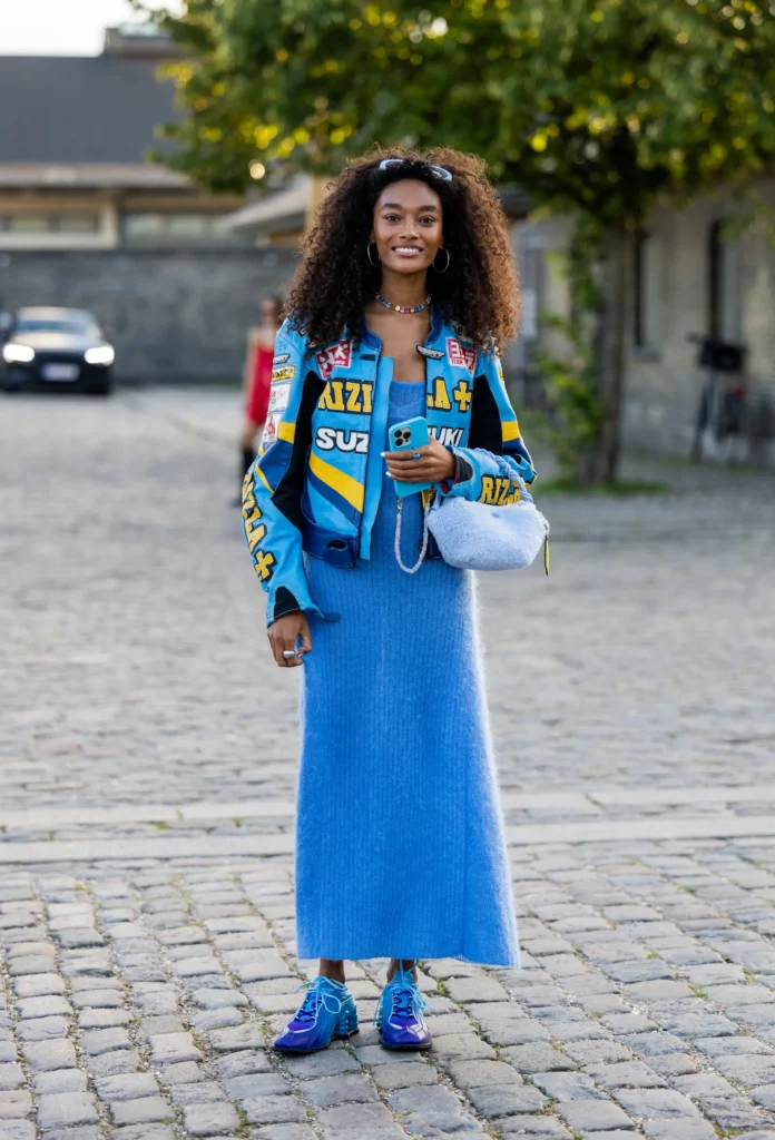 Her iridescent blue sneakers add even more impact, echoing the hues of the outfit while grounding the look in cool, urban energy. A fuzzy bag and colorful beaded choker finish the ensemble with playful charm, making it the perfect example of how to wear sneakers this season—without sacrificing an ounce of style.