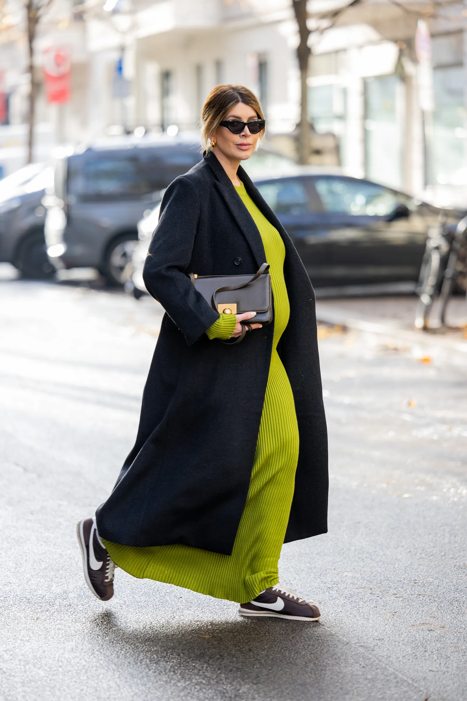 Pairing sporty sneakers with a bold, ribbed maxi dress and a structured black coat creates a sophisticated-meets-casual moment that’s ideal for transitional weather. The sleek silhouette of the coat balances the vibrancy of the lime green dress, while classic trainers keep the ensemble grounded and practical.