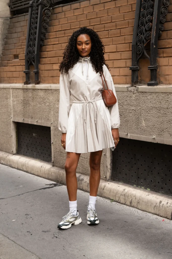 Elevate your sneaker game with a windbreaker-inspired dress that blurs the line between athletic and chic. The cinched waist and pleated skirt add femininity and shape, while the structured white sneakers keep the look fresh and functional.