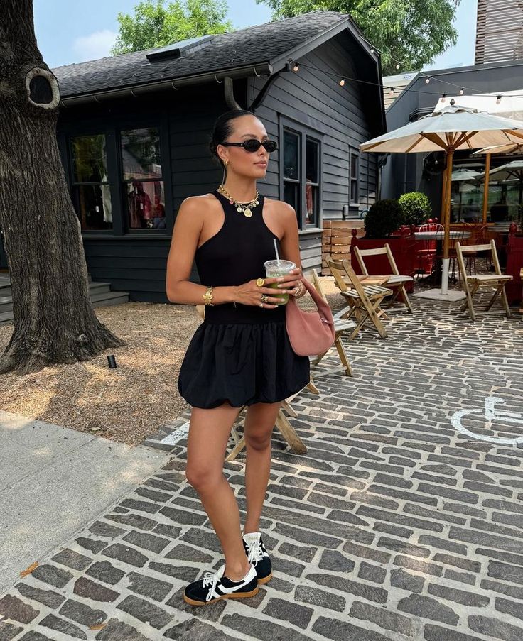 The pink shoulder bag adds a soft pop of color, while the black-and-white sneakers keep the look grounded and ultra-wearable. It’s a masterclass in turning basics into something memorable, perfect for iced coffee runs, outdoor brunches, or just strutting stylishly down a cobblestone path.