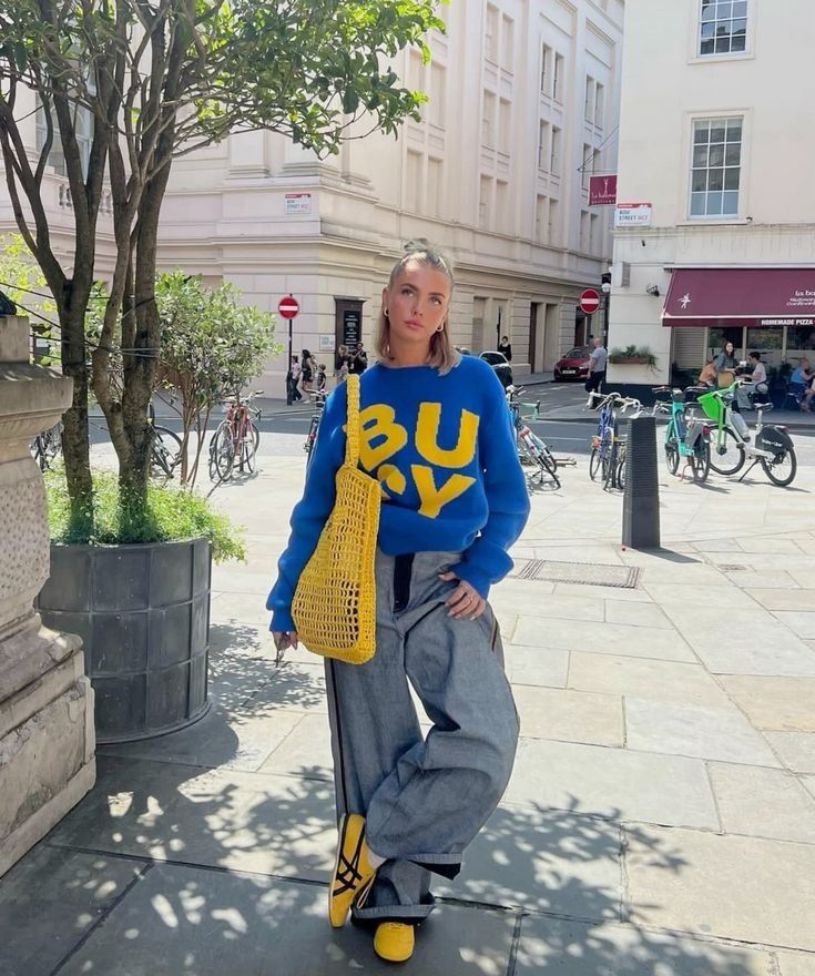 Leaning into bold color is a foolproof way to make sneakers look intentional—and anything but sloppy. The cobalt blue “BUSY” sweatshirt is a statement on its own, but when paired with wide-leg gray trousers and matching yellow sneakers and a knit tote, it becomes a full-on fashion moment.