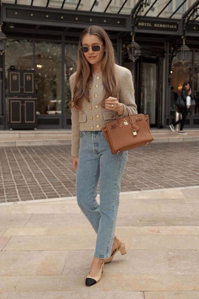 Paired with beige-and-black cap-toe Chanel slingbacks, the ensemble is polished yet comfortable, finished off perfectly with a rich tan Birkin bag and sleek sunglasses. It’s a masterclass in how to elevate jeans with high-end touches—ideal for a chic city stroll or a casual coffee meeting with flair.
