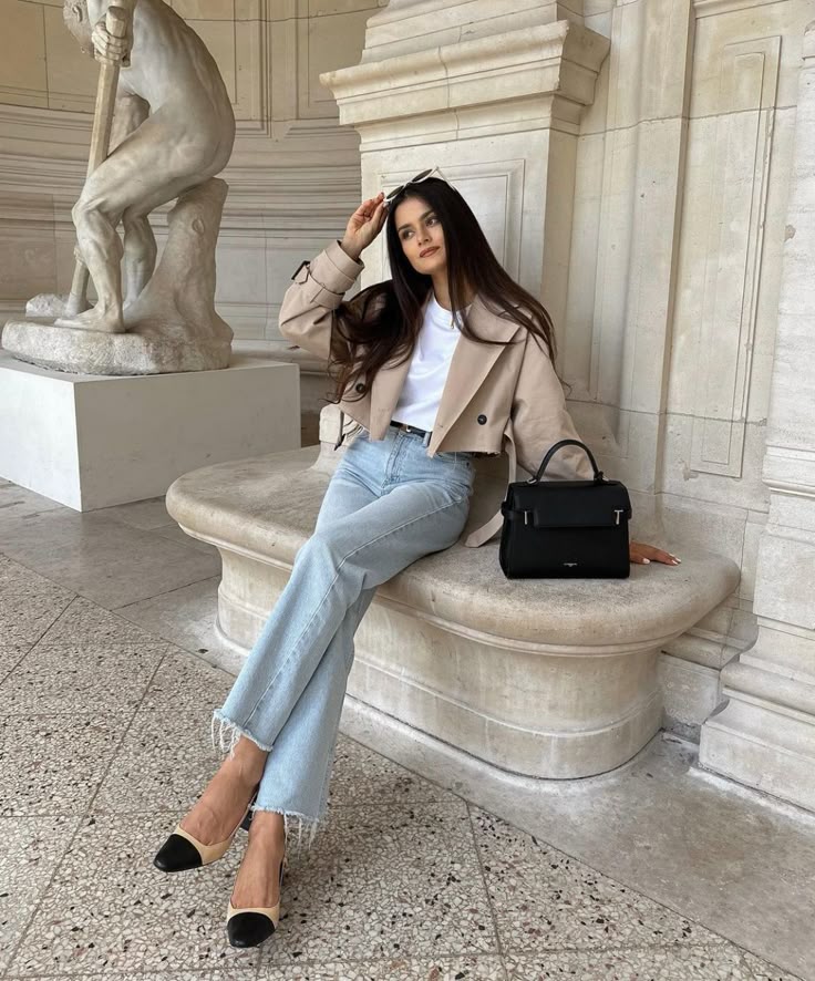 Cropped blue jeans offer a laid-back vibe while maintaining an air of effortless chic, and the Chanel bag is a subtle yet luxurious touch. The black-and-beige Chanel pumps bring a refined contrast, adding just the right amount of edge to the ensemble. This look is ideal for a city stroll or a coffee date, offering a balance of style, comfort, and luxury.