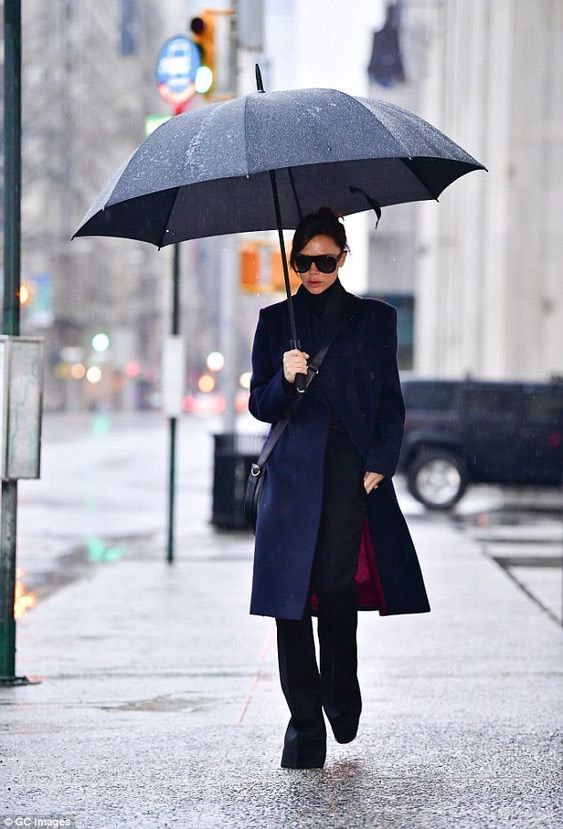 Under the shield of a classic black umbrella, this all-dark ensemble channels timeless city elegance. A tailored navy coat drapes sharply over wide-leg trousers and a turtleneck, creating a streamlined silhouette that’s both modern and functional. The subtle maroon lining peeking from the coat adds a refined pop of color and depth to the outfit.