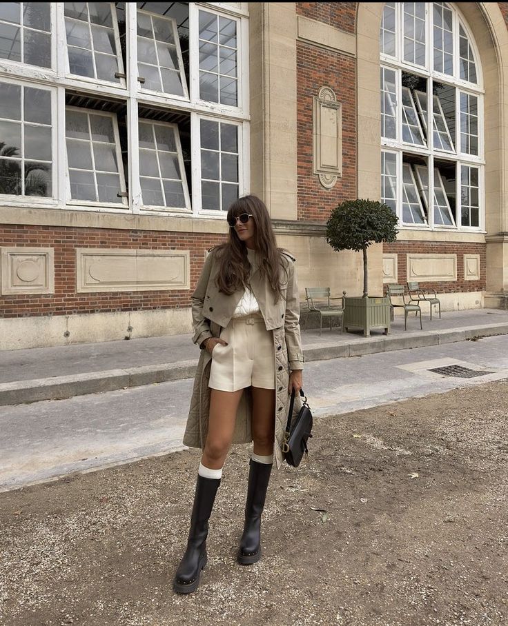 Neutral layers make a bold impact in this elevated wet-weather outfit. A lightweight trench is effortlessly draped over a matching ivory top-and-shorts set, striking the perfect balance between seasonal transition and statement style. Chunky knee-high rain boots ground the look with a practical edge, while the contrast of cozy white socks adds subtle interest.