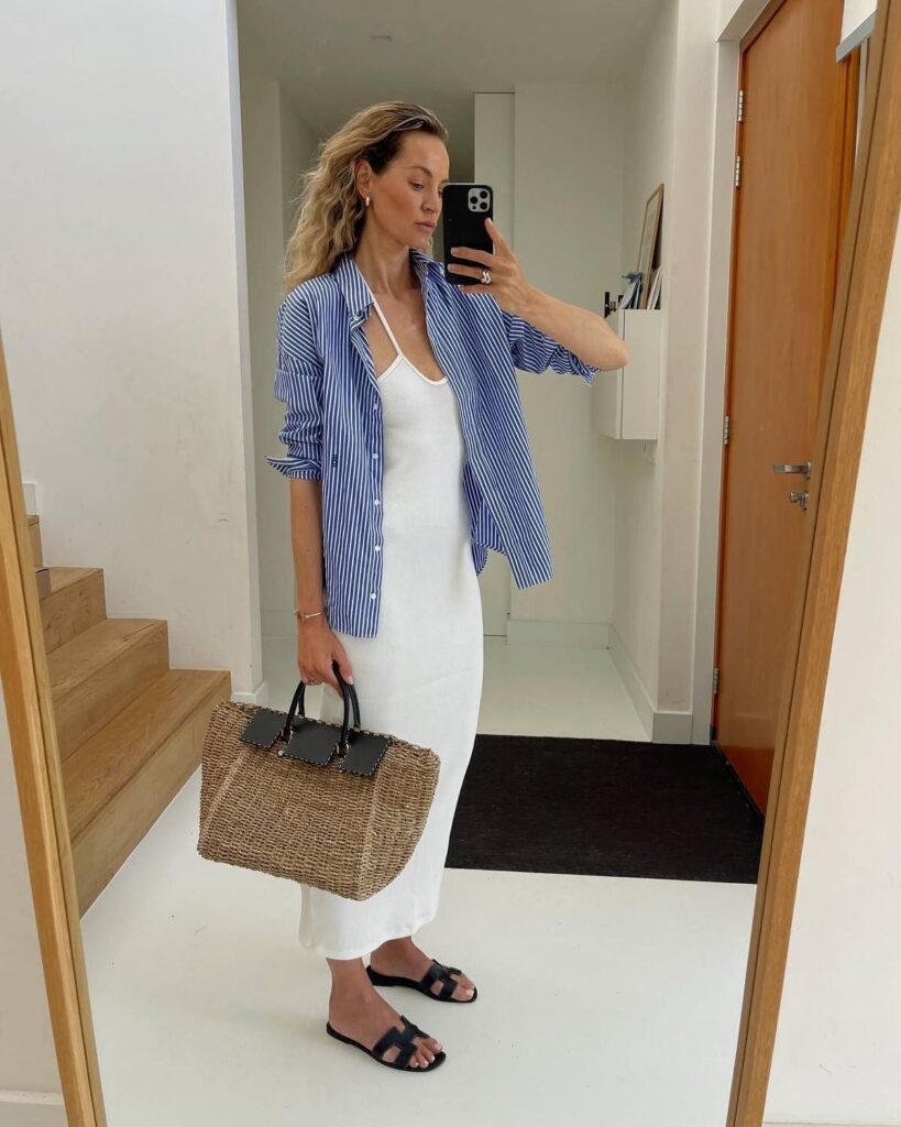 Clean lines and breezy silhouettes make this outfit a tall-girl favorite. The white midi dress offers an elongating effect, enhanced by a crisp blue striped shirt worn undone for an effortlessly relaxed vibe.