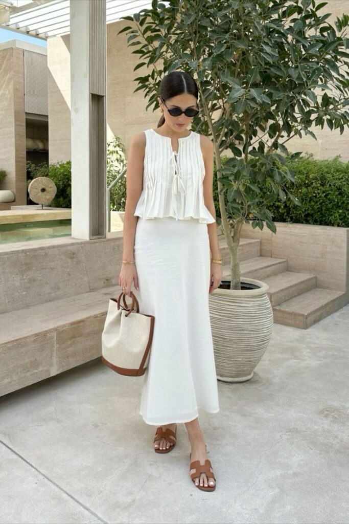 Brown leather slides and a coordinating tote ground the outfit with natural textures, perfect for vacation strolls or warm-weather brunches. The streamlined silhouette and breezy palette offer understated glamour that feels timeless and refined.