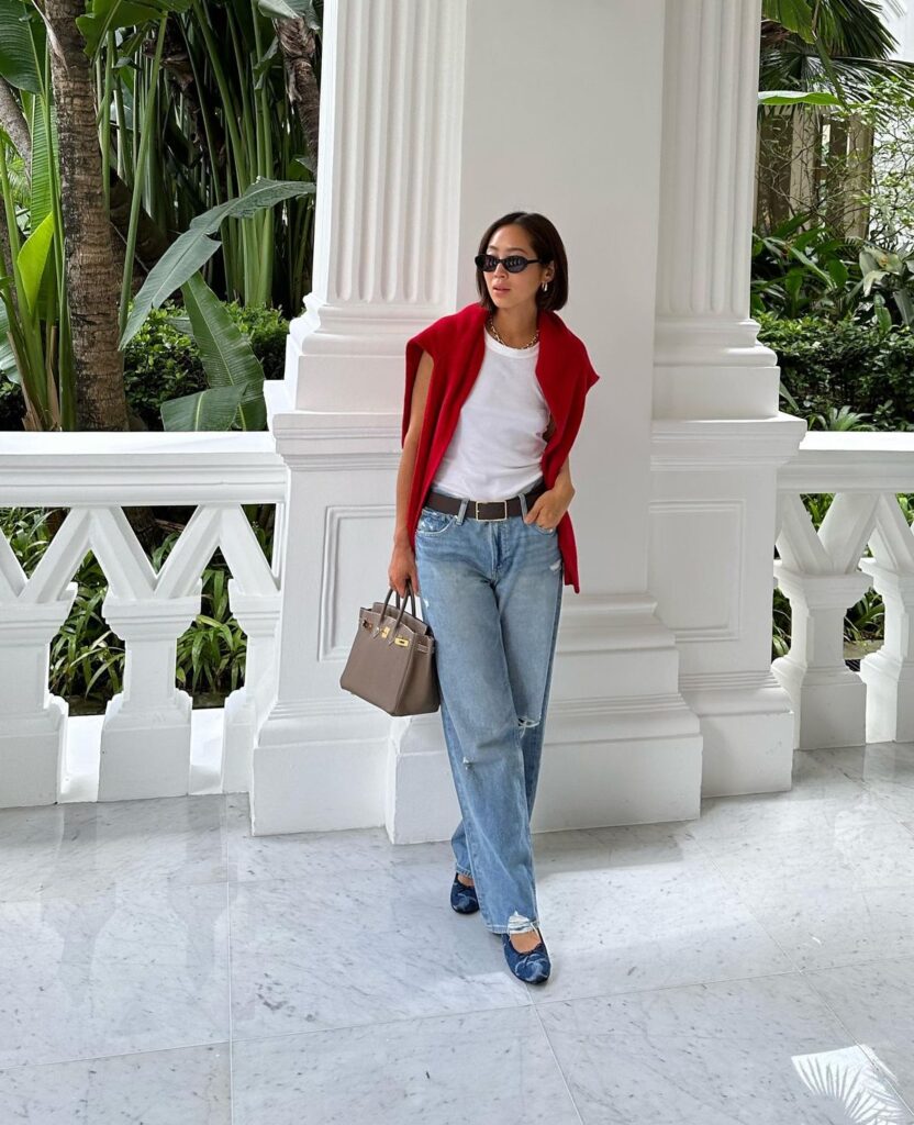 This effortlessly chic look proves that tall girls are mastering the art of refined casual wear. A white tee and relaxed denim jeans form the perfect laid-back base, while a red sweater draped over the shoulders injects an instant dose of color and polish.