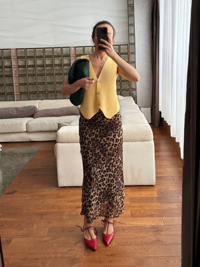 Leaning into an unexpected combination, this look proves that contrast can be incredibly chic. The lemon-yellow ribbed vest offers a tailored structure that complements the flowing silhouette of the leopard-print slip skirt, creating a polished yet playful ensemble.