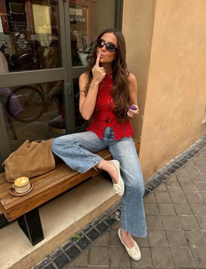 Meanwhile, the flared jeans with swirling embroidery at the hem create visual interest and balance, elongating the frame even further. Woven flats and a slouchy suede bag complete the casual café-ready vibe, proving that comfort and cool can absolutely go hand in hand.