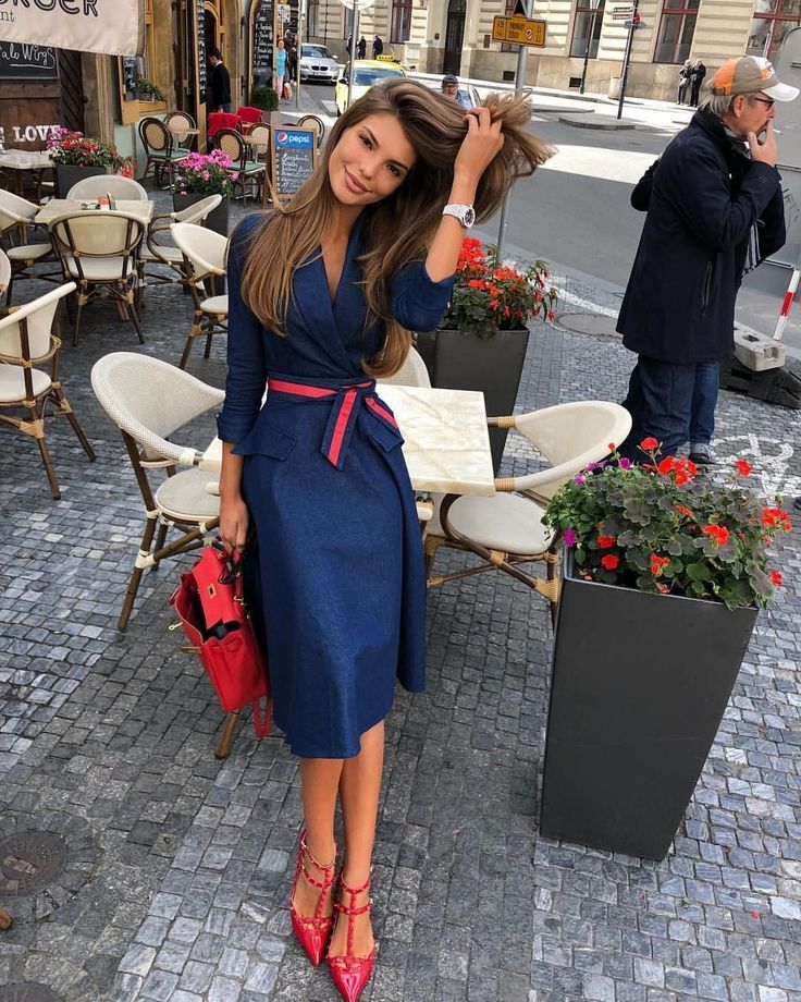 Pairing cherry red heels with a navy dress creates a dynamic and eye-catching look that exudes confidence.