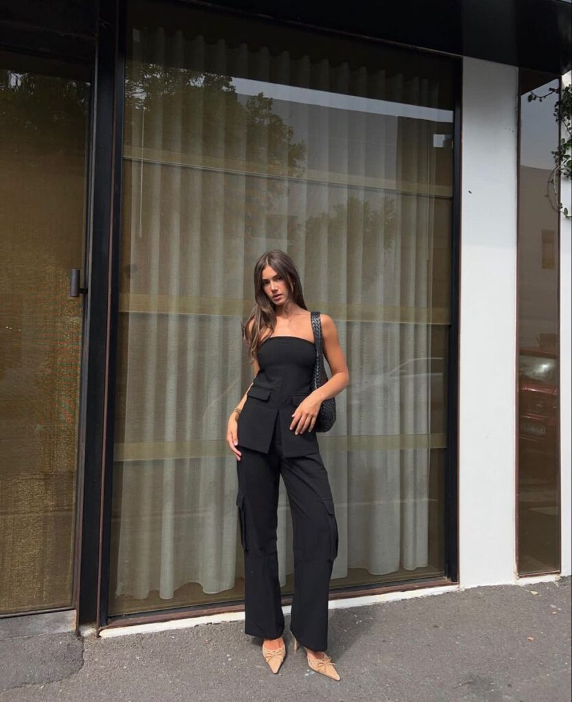 Here’s a polished way to do all-black with a modern twist. The strapless structured top instantly elevates the look, while cargo-inspired tailored trousers bring a fresh, unexpected edge. The sharp silhouette is refined yet playful, proving that black can be both sleek and fashion-forward.