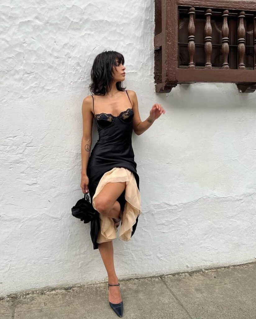 A silky black slip dress with delicate lace cups creates a sultry, lingerie-infused mood that feels daring yet sophisticated. Layers of nude tulle peek out from the asymmetrical hem, adding movement and a touch of romantic contrast to the sleek satin.
