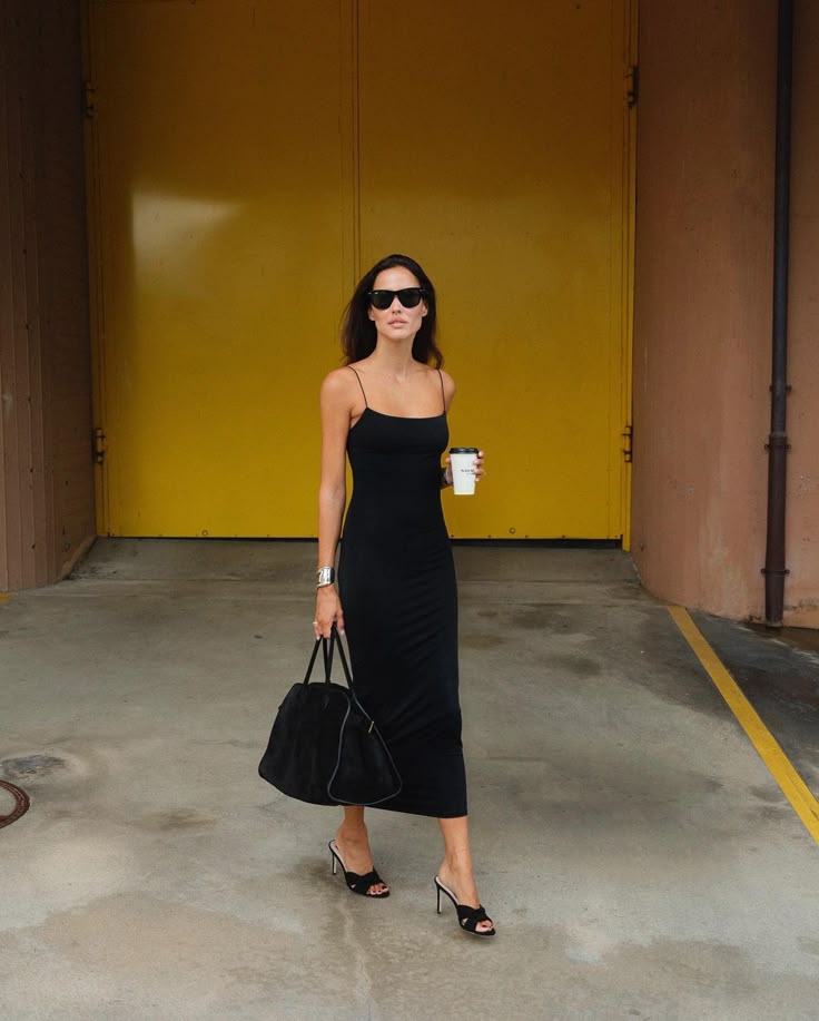 A fitted black spaghetti-strap midi dress sets a refined and sensual tone, perfect for an upscale night out. Minimalist yet striking, the silhouette hugs the figure effortlessly while allowing the wearer to move with confidence. Polished black heeled mules elevate the look, adding just the right amount of drama without overpowering the streamlined style.