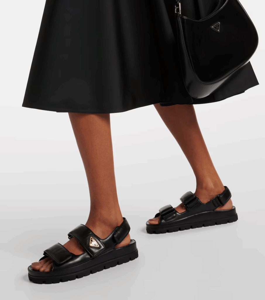 Quilted leather elevates the humble velcro sandal into luxury territory, proving that high fashion and practical closures can coexist beautifully. The signature triangular logo adds instant recognition value.