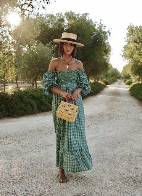 Rooted in classic gingham but elevated through proportion and texture, this outfit perfectly captures the modern boho spirit. The off-the-shoulder green dress features voluminous sleeves and a ruffled hem, bringing sculptural drama to a soft, pastoral print.