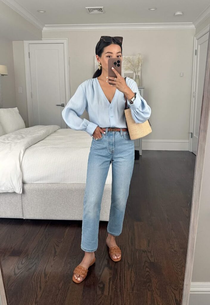 The light blue blouse tucked into the high-waisted denim brings softness and a touch of sophistication to the outfit, while the tan belt and woven straw bag add texture and warmth, tying everything together beautifully.