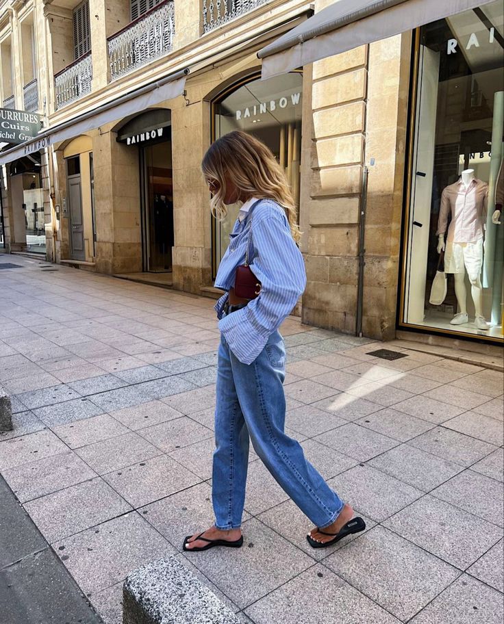 Straight jeans meet their perfect match in these minimalist black flip-flop sandals, creating an effortlessly chic look that balances comfort with style. The light-wash denim offers a relaxed vibe, while the oversized striped button-down shirt, nonchalantly half-tucked, adds structure and a hint of sophistication.