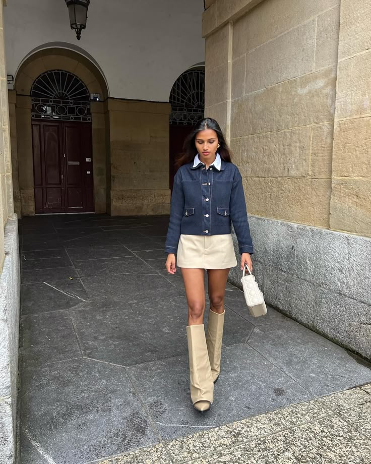 The standout piece? Knee-high beige boots with a sculptural silhouette echo ‘60s mod but feel utterly fresh. The textured mini bag adds dimension without distracting from the minimalist palette. Everything is cohesive, elevated, and intentional—from the sleek hair to the confident stride. It’s the kind of outfit that feels fashionable without trying too hard.
