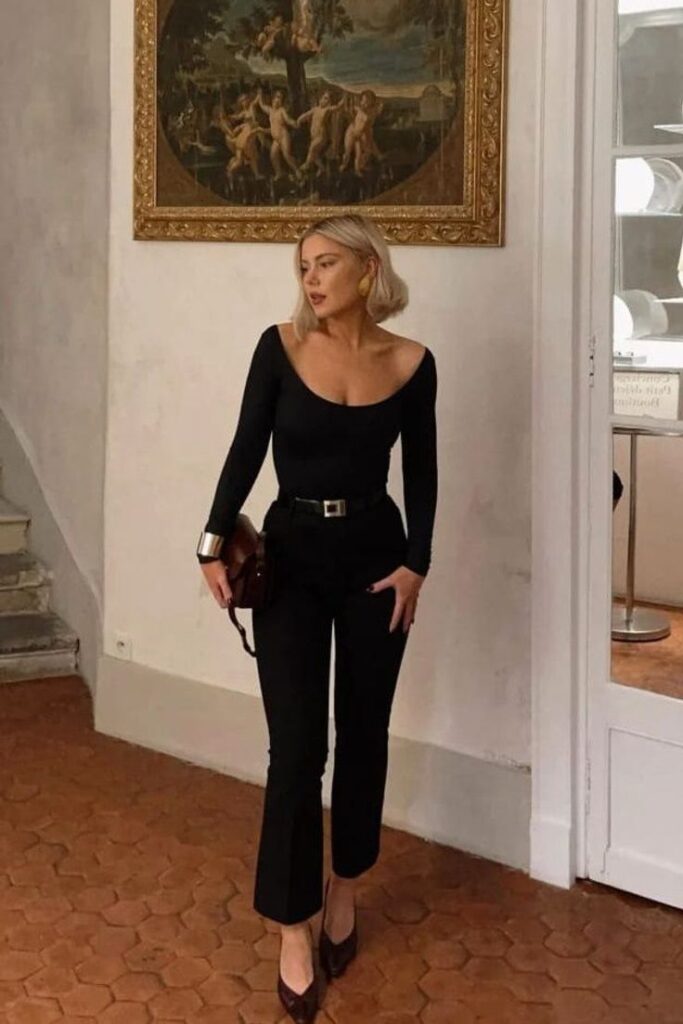 Minimalism meets bold sophistication in this sleek dinner-ready outfit. A deep scoop neckline adds a touch of drama to the fitted top, subtly elevating the otherwise understated black palette.