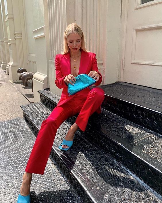 What really elevates the look is the unexpected pop of turquoise—a textured clutch and matching heels that contrast beautifully with the red, making the outfit feel fresh and playful. Simple layered gold necklaces offer just the right amount of shine without competing with the vibrant colors. This ensemble is a masterclass in color blocking, perfect for turning heads at any chic city outing.