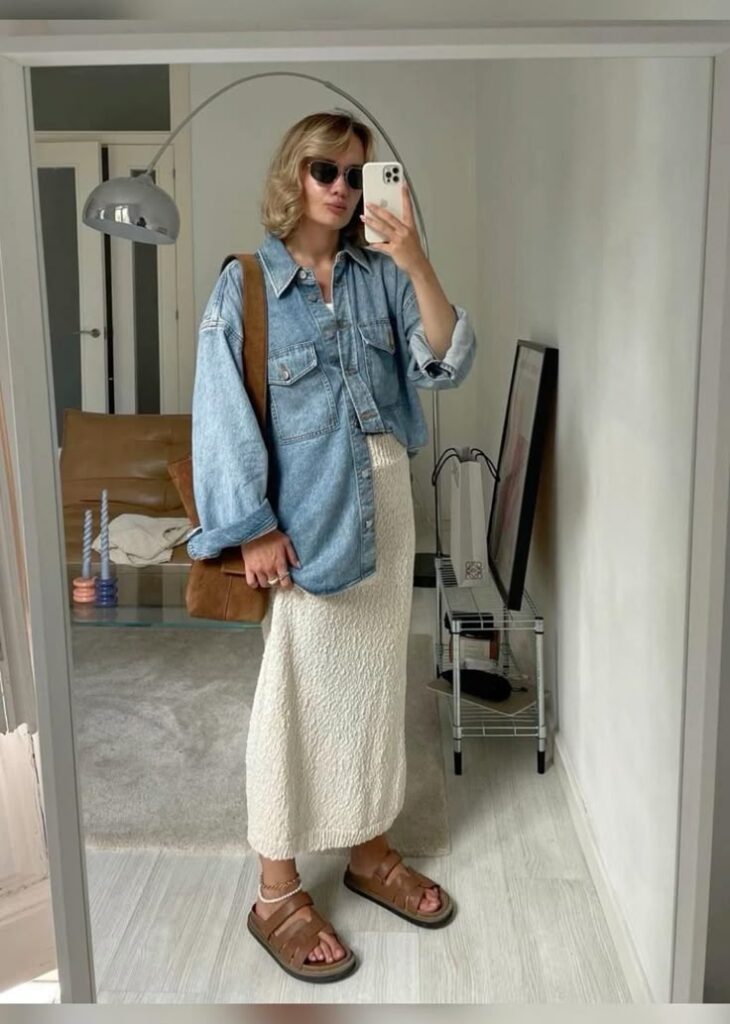 This look is a masterclass in balancing structure and softness with a laid-back attitude. The chunky brown sandals paired with the oversized suede tote create a grounded yet effortlessly cool vibe. A textured cream midi skirt and slouchy denim shirt add dimension, offering a casual contrast that feels both elevated and approachable.