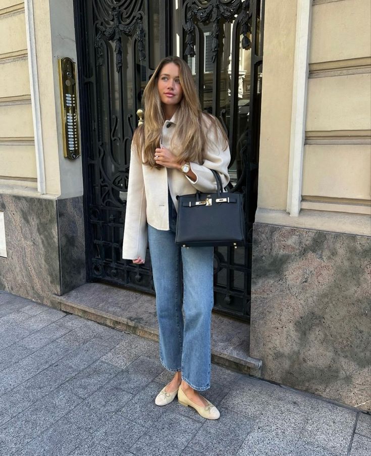 A creamy jacket paired with classic blue jeans strikes the perfect balance between casual and refined. The structured black handbag lends a touch of elegance, complementing the neutral tones beautifully. Soft beige ballet flats ground the look, offering comfort without sacrificing style.