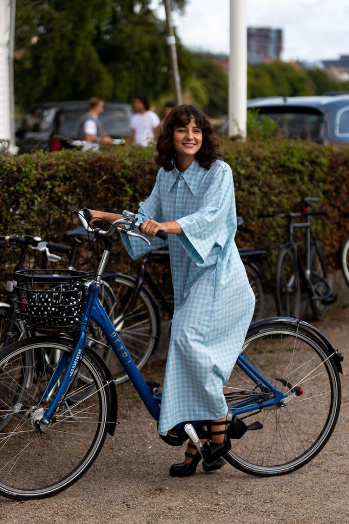 Mary Janes are a surprising yet delightful choice for a bike ride, providing both comfort and a touch of elegance. They ground the softness of the dress with a bit of edge, proving that practical style can still be fashion-forward and fun.