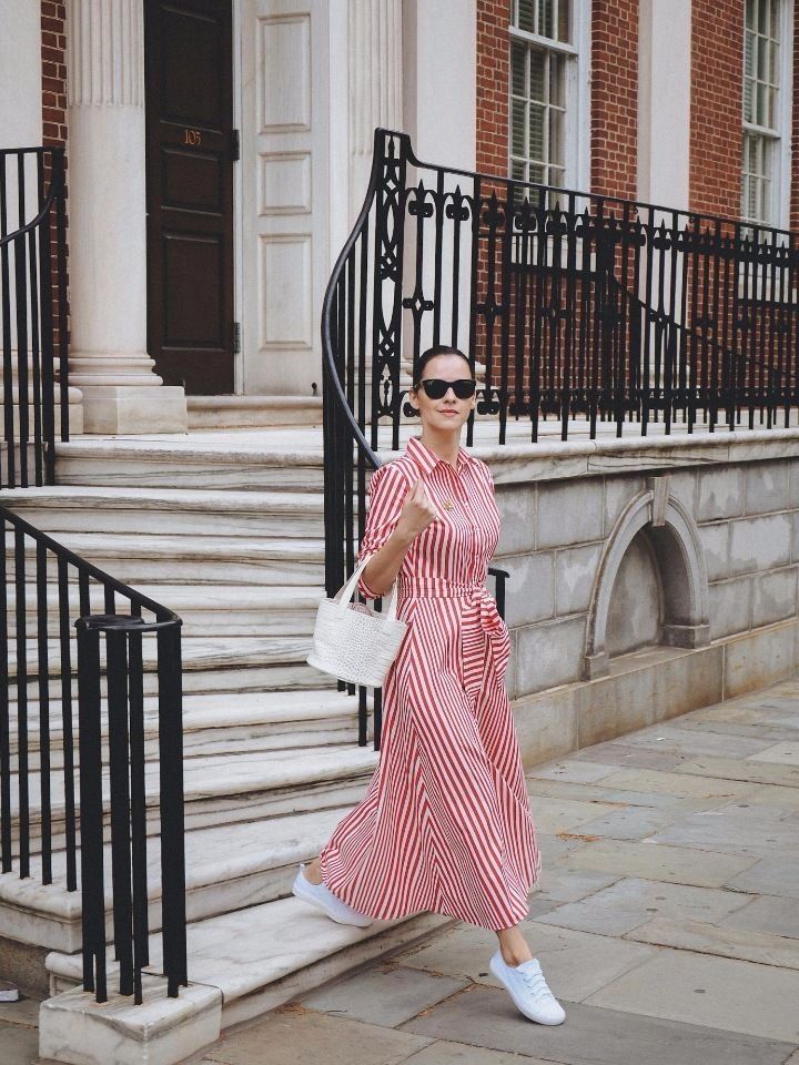 There’s no denying the appeal of sneakers with a midi dress, especially when comfort meets elevated street style. This red-and-white striped shirtdress flows beautifully with every step, while the crisp white sneakers ground the look with a laid-back, modern edge.