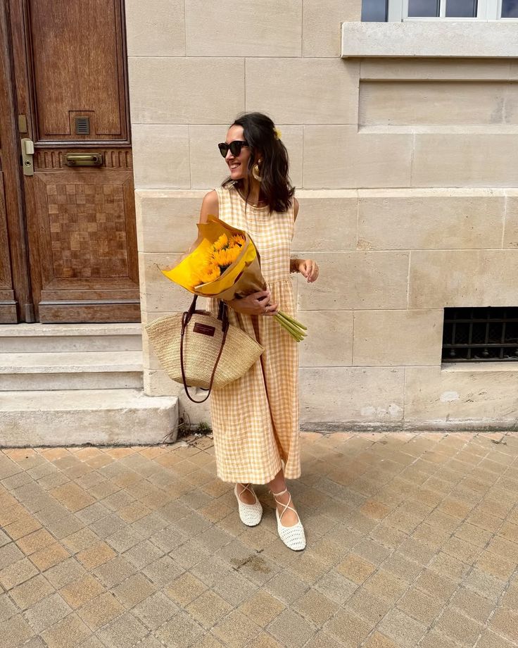 Finished with layered gold jewelry, a raffia bucket bag, and tinted sunglasses, this look is the epitome of Mediterranean-chic. The sandals prove to be the hero — versatile, comfortable, and undeniably stylish, they make this outfit ideal for anything from market strolls to seaside lunches.