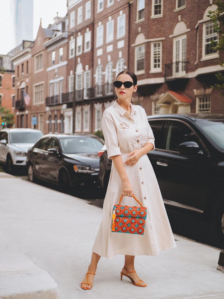 Poised and powerful, this ensemble exudes refined minimalism with its crisp button-front midi dress, tailored to perfection. The subtle flare of the skirt balances the structure, while a vibrant, textured handbag injects a playful splash of color.