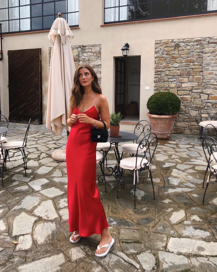 Wearing a vibrant red slip dress, this look captures an easy, sultry elegance that’s impossible to ignore. The fluid silhouette skims the body beautifully, offering a dose of glamour with minimal effort—perfect for summer evenings or destination escapes.