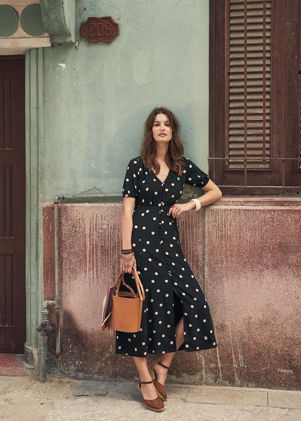 Polka dots and ankle-strap wedges are a pairing that never loses its charm. This classic black midi dress, scattered with playful cream dots, oozes timeless appeal, while the earthy-toned espadrille wedges add a grounded yet flirty finish. The shoes not only elongate the legs but also provide a sturdy base that’s perfect for all-day wear — whether you’re wandering sun-soaked alleys or sipping espresso streetside.