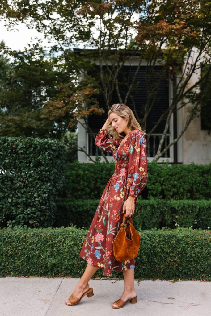 A floral-print midi dress in rich, autumnal tones brings an air of effortless charm, while its smocked waist and billowy sleeves lend a flattering, feminine touch. The earthy palette is perfectly complemented by warm-toned accessories that harmonize beautifully with the season’s hues.