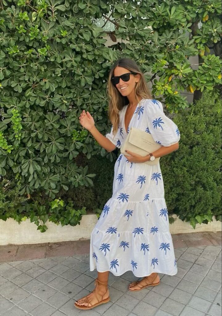 An embroidered white midi dress adorned with playful blue palm trees captures the essence of summer ease. Its relaxed, tiered silhouette and deep neckline create a flattering, unfussy vibe—perfect for strolling through coastal towns or brunching al fresco.
