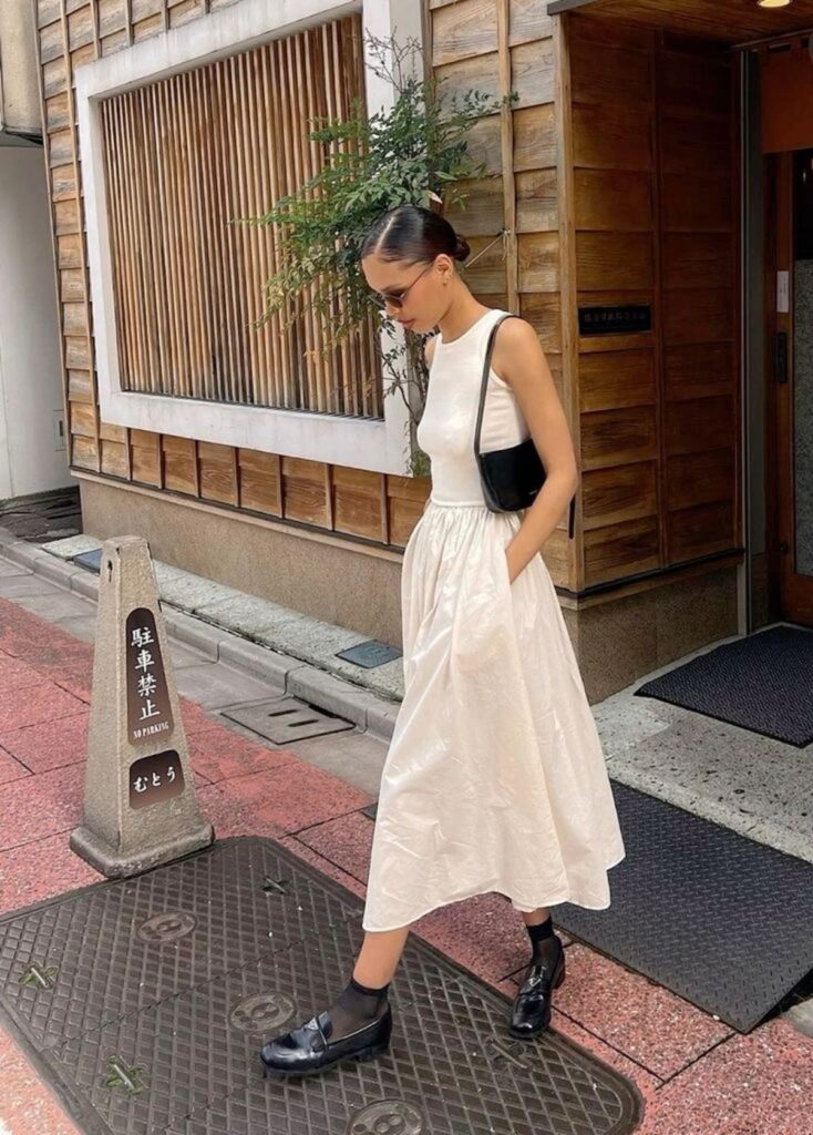 Glossy black loafers paired with sheer black socks introduce an edgy twist that’s equal parts fashion-forward and functional. This unexpected pairing proves that midi dresses don’t always need delicate shoes—chunkier styles can add character and urban polish with ease.