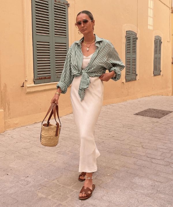 Nothing complements a sleek midi dress quite like a pair of classic leather slides. Here, the tan sandals ground the silky ivory slip dress with a touch of casual elegance, making the whole outfit feel approachable yet polished. The addition of a striped button-down shirt, tied at the waist, adds dimension and a soft structure that contrasts beautifully with the fluid silhouette.