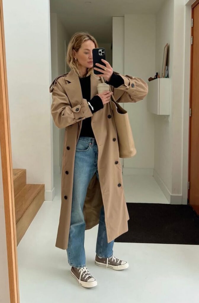 This is the kind of outfit that proves how powerful simple pieces can be when styled with intention. A traditional trench is layered effortlessly over a black sweater and relaxed straight-leg jeans, creating a look that feels unfussy yet chic.