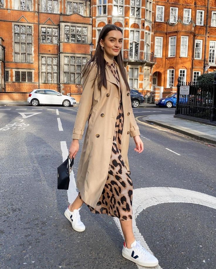 There’s something effortlessly stylish about pairing a timeless beige trench coat with bold prints, and this look nails it. The leopard print dress adds a fun, unexpected edge, while the crisp white Veja sneakers keep things grounded and casual.