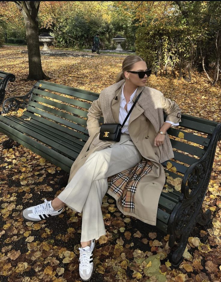A classic trench layered over soft cream trousers and a crisp button-down strikes a perfect balance between tailored elegance and casual ease. Adidas sneakers ground the ensemble with a cool, effortless edge, while the casually draped knit over the shoulders adds a touch of relaxed charm.