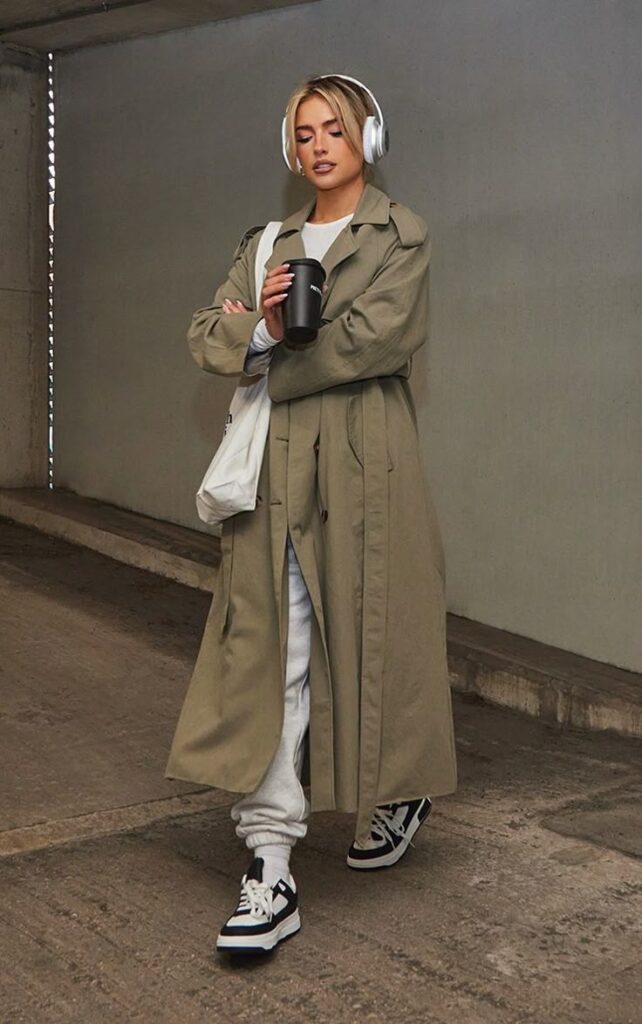 Black-and-white sneakers tie the outfit together with a sporty edge, while wireless headphones and a crossbody bag keep it practical for city life. It’s a smart mix of elevated and casual—proof that a trench can go way beyond formal wear.