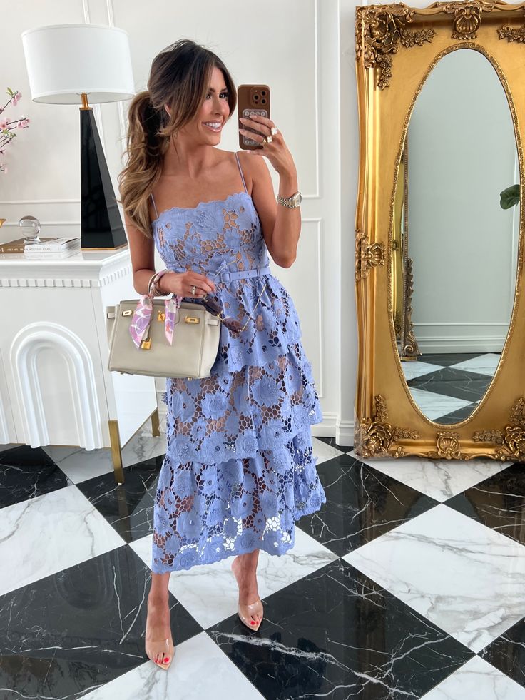 A lilac lace dress this intricate deserves shoes that enhance its romantic charm—and the clear heels seen here are a perfect match. Their minimalist design allows the detailed floral cutouts and soft tiers of the dress to take center stage while still offering a polished finish.