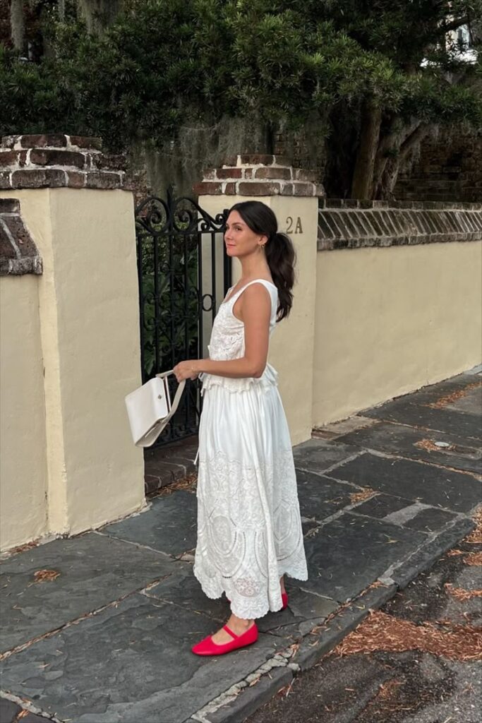 Romantic lace gets a bold boost with a pair of cherry-red ballet flats that instantly steal the spotlight. The soft femininity of the embroidered white dress contrasts beautifully with the vibrant shoes, creating a playful yet elegant balance.