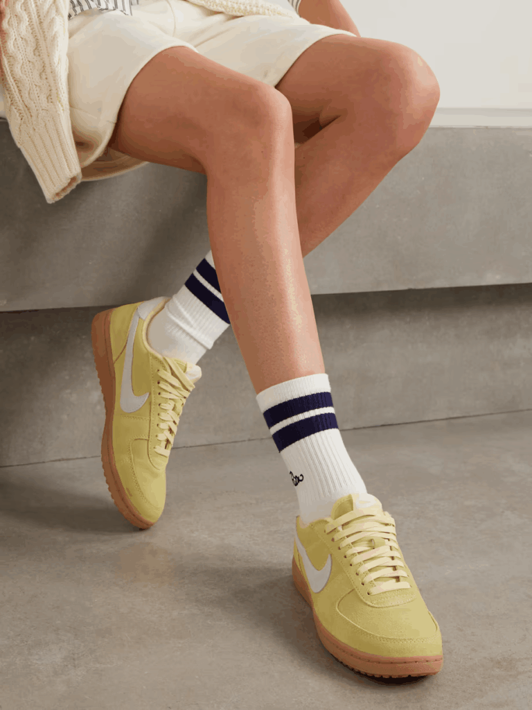 Architectural lines define Proenza Schouler’s sophisticated entry into the buttery yellow sneaker conversation. These Track sneakers blend luxury materials with unexpected proportions for a distinctly modern feel.