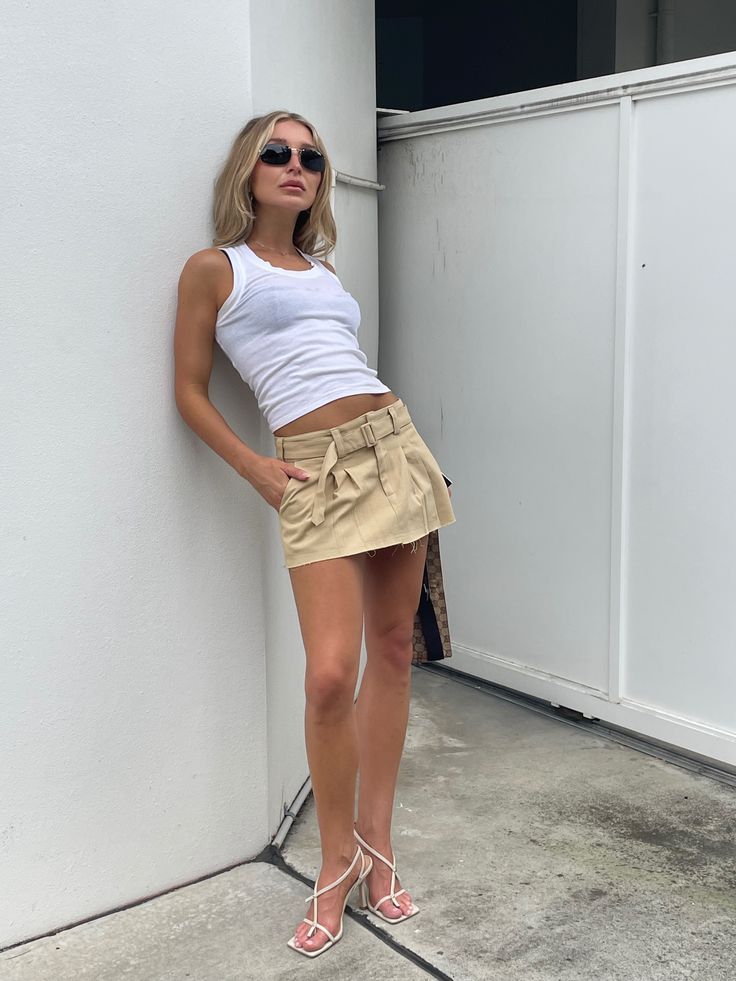 Here’s proof that cargo skirts are no longer just for utility—they’re a style statement. The structured olive midi skirt balances functionality with elegance, featuring bold patch pockets and a flattering belted waist. A fitted cream ribbed tank adds contrast while keeping the palette neutral and elevated.