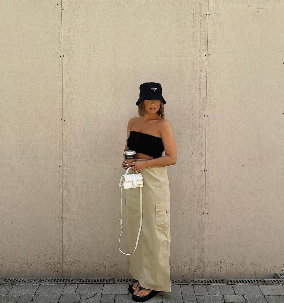 This look masters the art of blending streetwear with minimalist chic. The khaki cargo maxi skirt introduces structure and utility, while the fuzzy black bandeau keeps it effortlessly edgy. Accessories like the white micro crossbody and sleek black bucket hat add a polished contrast, balancing sporty and stylish.