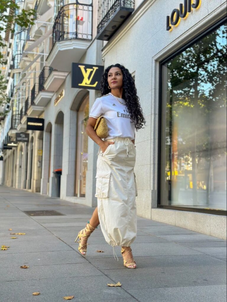 Blending athletic inspiration with polished flair, this look elevates the cargo skirt to unexpected heights. The Real Madrid jersey offers a relaxed, sporty contrast to the high-shine finish and voluminous silhouette of the gathered hem cargo skirt.