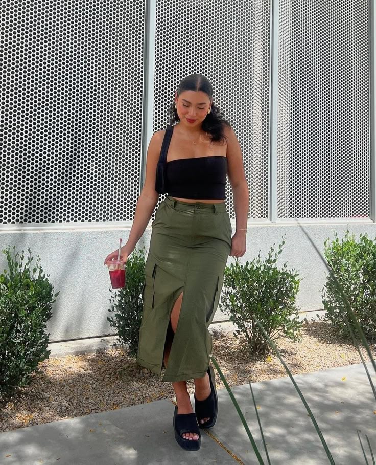 Sleek, minimal, and made for movement, this look proves cargo skirts are the cool-girl essential of the season. The olive green skirt with front slit and flap pockets delivers a functional edge while hugging the silhouette in all the right places.