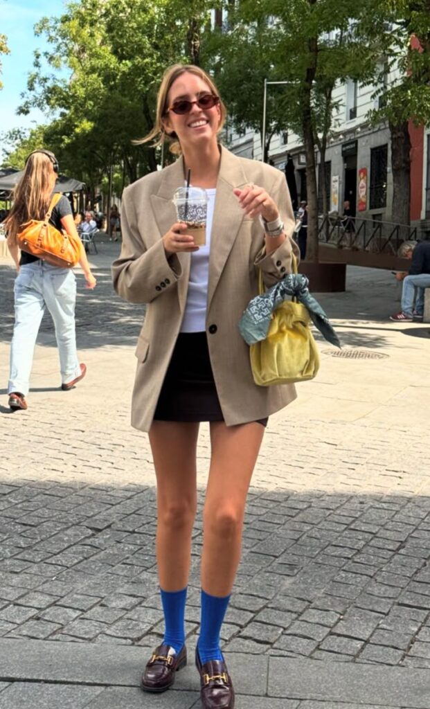 This outfit takes the classic preppy aesthetic and adds a bold pop of color for a refreshing summer twist. An oversized beige blazer provides structure and contrast against a white tee and a sleek black mini skirt, while bright cobalt socks offer a surprising yet playful punch.